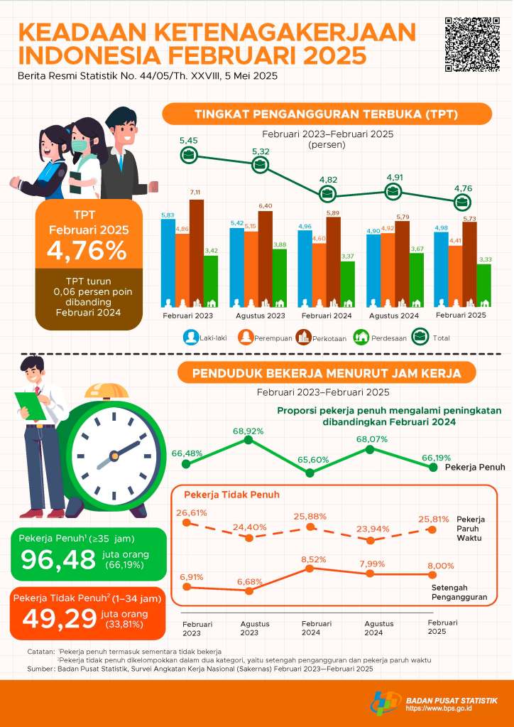 - Tingkat Pengangguran Terbuka (TPT) pada Februari 2025 sebesar 4,76 persen, turun 0,06 persen poin dibanding Februari 2024.